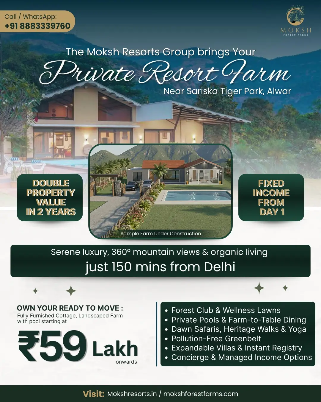 A warm welcome to The Moksh Sariska Nature Resorts. We encourage our customers to come out of the digital world, avoid the digital eye strain and fatigue for the few hours and days you are with us; Now it’s time to pamper Yourself, bonding with your loved ones, indulging in Mother Nature, Meditation, Relaxation, Spa, Music, Dance and the many Gaming and Adventure activities at The Moksh Resorts.
